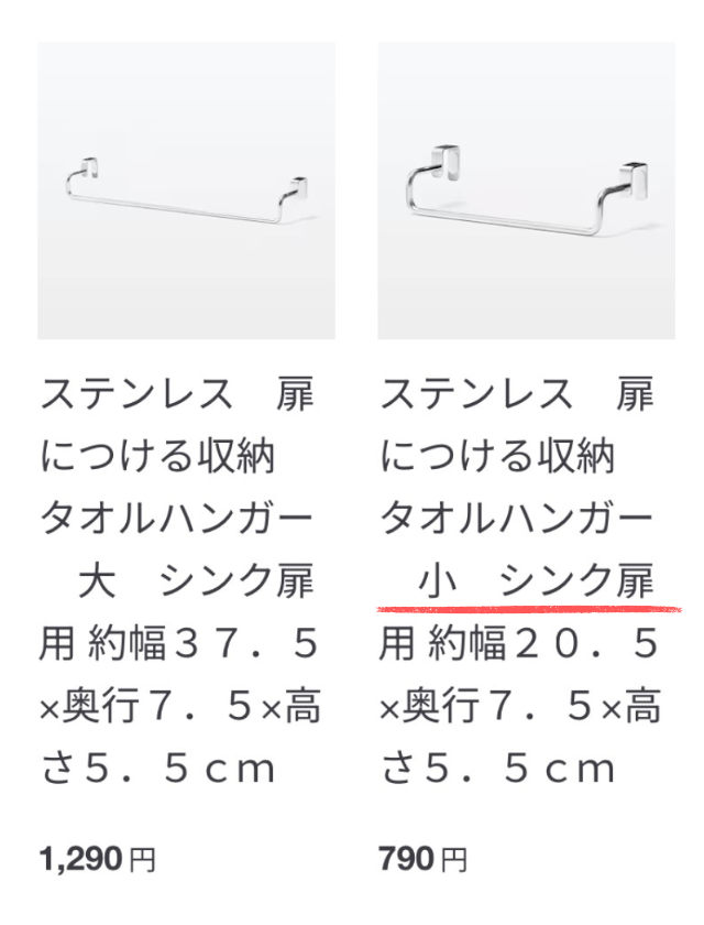 2つ目は「ステンレス 扉につける収納 タオルハンガー 小 シンク扉用」「無印良品」です。