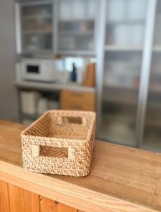 ラタンのシリーズでは、大きめな幅36×奥行26㎝のサイズ展開のボックスを、ラックや収納棚に入れて使うことが多いと思います。